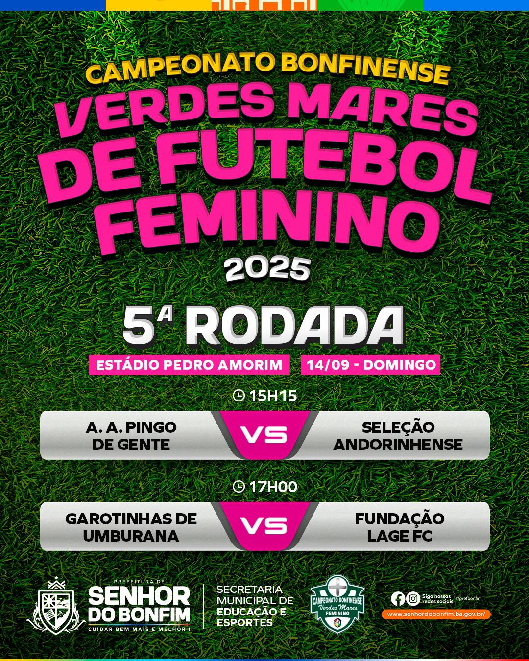 Para fechar a programação, o domingo reserva mais uma rodada do Campeonato Bonfinense Verdes Mares de Futebol Feminino, no Estádio Pedro Amorim. A bola rola às 15h15 com o duelo entre Pingo de Gente e Seleção Andorinhense, e às 17h Garotinhas de Umburana enfrentam a Fundação Lage FC.