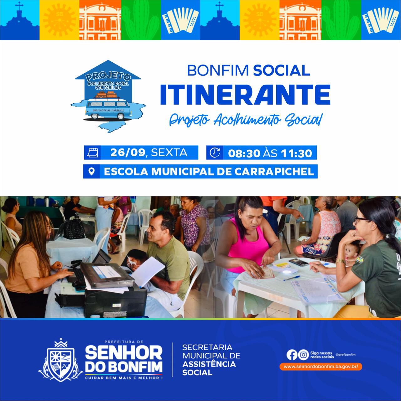 A Prefeitura de Senhor do Bonfim, por meio da Secretaria Municipal de Assistência Social, promove nesta sexta-feira (26) mais uma edição do projeto “Bonfim Social Itinerante”, iniciativa que fortalece as políticas públicas sociais voltadas às famílias em situação de vulnerabilidade econômica e social, levando serviços essenciais diretamente às comunidades.