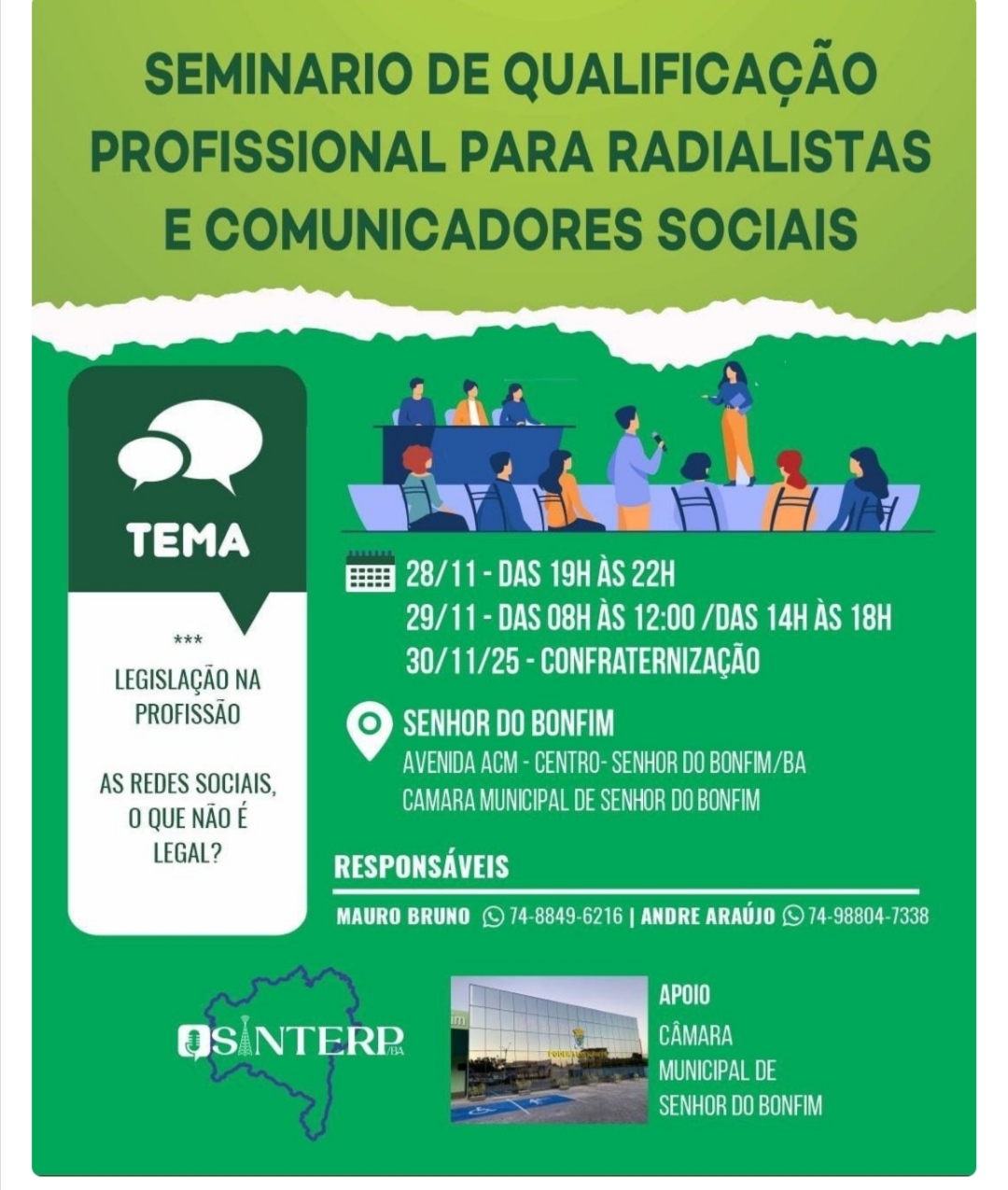 Nos dias 28 e 29, a Câmara Municipal de Senhor do Bonfim será palco do Seminário de Atualização Profissional para Radialistas e Comunicadores, uma ação importante promovida pelo SITERP – Sindicato dos Trabalhadores e Empresas de Rádio, TV e Publicidade da Bahia.