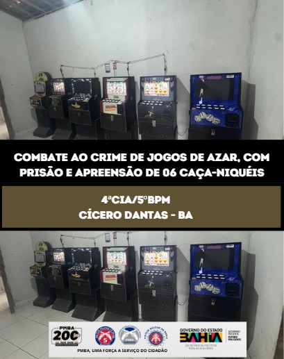 Quinta-feira, dia 11,por volta das 16:00h, durante diligência realizada pela Guarnição 4ªCia/5ºBPM – Cícero Dantas, foi constatada a presença de máquinas caça-níqueis em funcionamento no interior do estabelecimento localizado na Rua José Pereira Gama. No local, foram apreendidas 6 máquinas eletrônicas de jogos de azar (caça-níqueis), em funcionamento e acessíveis ao público. O responsável pelo estabelecimento foi conduzido à delegacia para prestar esclarecimentos.