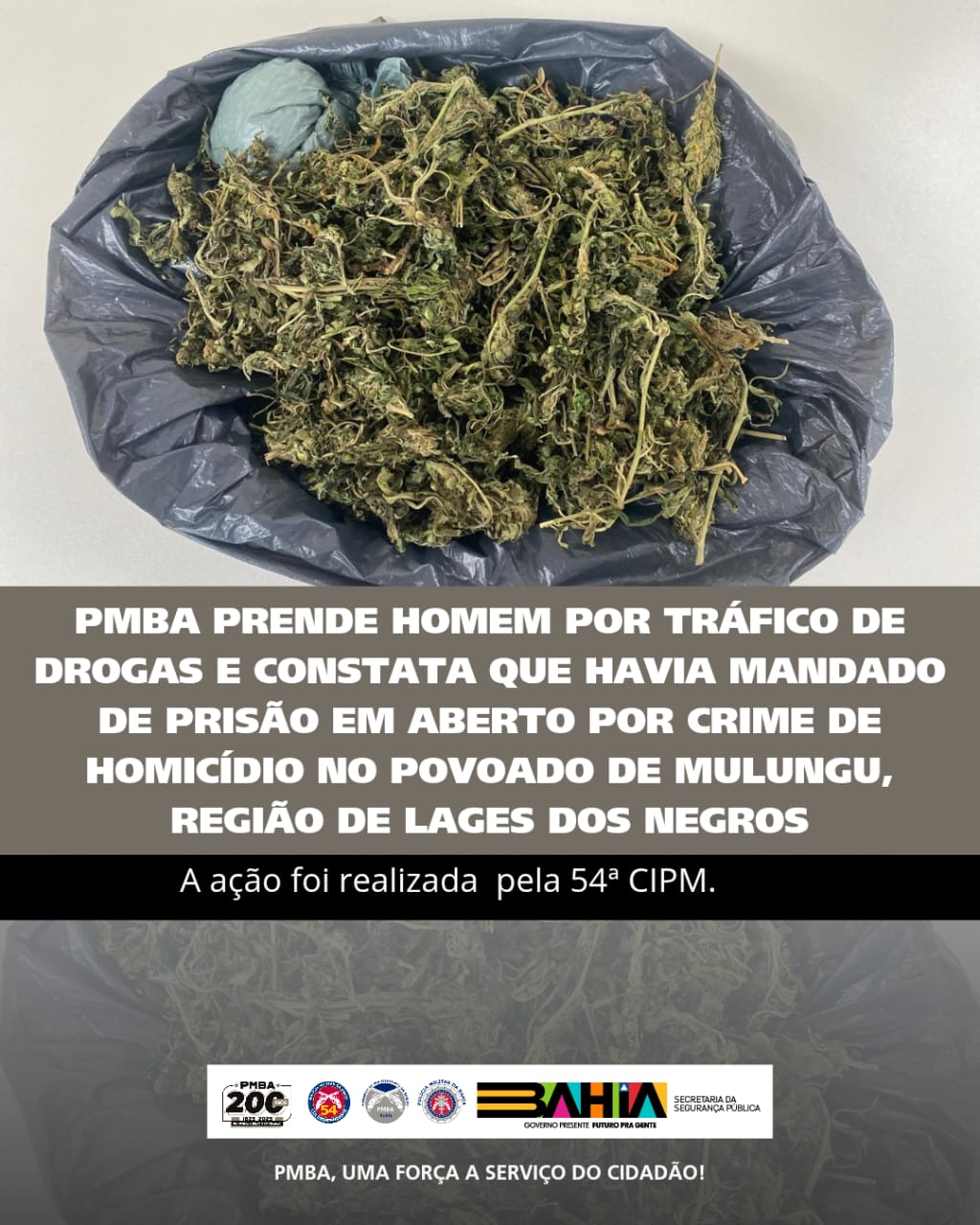Por volta das 12h00, ao realizar rondas ostensivas no Povoado de mulungu, região de Laje dos negros, a g.u foi informada por populares que na localidade um senhor estava praticando tráfico de drogas e, era conhecido que ele teria vindo de Minas Gerais, fugitivo da justiça. No local indicado, a guarnição PM avistou e abordou o suspeito que se encontrava com uma pochete e nela uma quantidade de maconha. Depois de encontrada a droga foi feita uma pesquisa e constatado que o conduzido tem um mandado de prisão em aberto no estado de Minas Gerais, pelo crime de homicídio. O mesmo foi conduzido com o material apreendido para a Delegacia para medidas cabíveis.