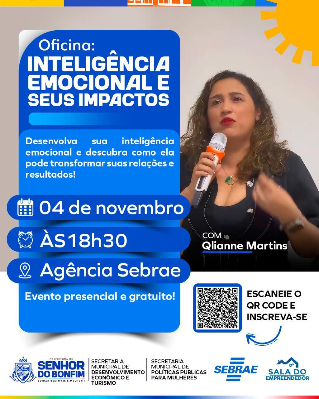 A Prefeitura de Senhor do Bonfim, por meio da Secretaria Municipal de Desenvolvimento Econômico e Turismo e da Secretaria de Políticas Públicas para Mulheres, em parceria com o Sebrae e a Sala do Empreendedor, realiza nesta terça-feira (4), às 18h30, na Agência Sebrae, a oficina “Inteligência Emocional e seus Impactos”.