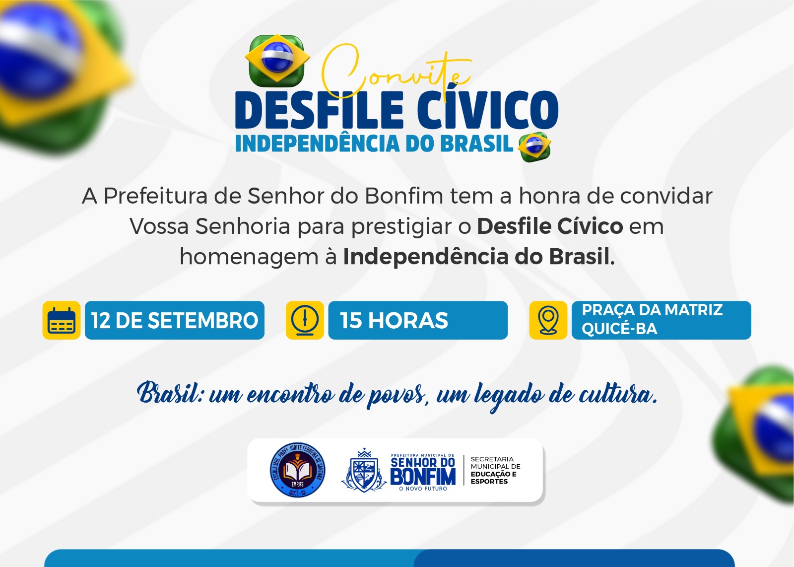 A Prefeitura de Senhor do Bonfim tem a honra de convidar Vossa Senhoria para prestigiar o Desfile Cívico em homenagem à Independência do Brasil.