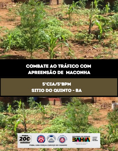 Por volta das 9:00 hs da 5ªCia/5ºBPM – Sitio do Quinto recebeu uma denúncia, de que no Povoado Planalto, Sítio do Quinto. Um indivíduo mantinha no quintal de sua residência um Cultivo de plantas análogas à Maconha. Ato contínuo, foi feito o deslocamento até o referido local e constatado a veracidade da denúncia, pois foi possível acessar o quintal pelos fundos da residência e visualizar a plantação contendo aproximadamente 50 pés. Diante do evidente flagrante delito, procedemos com buscas no local e encontramos uma sacola contendo sementes análoga à maconha e também insumos para adubação do plantio. O proprietário não se encontrava no local, logo a plantação foi colhida e junto com os demais matérias levada para a devida apresentação na DP local, número da ocorrência: 540673/2025, na DT de Sítio do Quinto/BA.