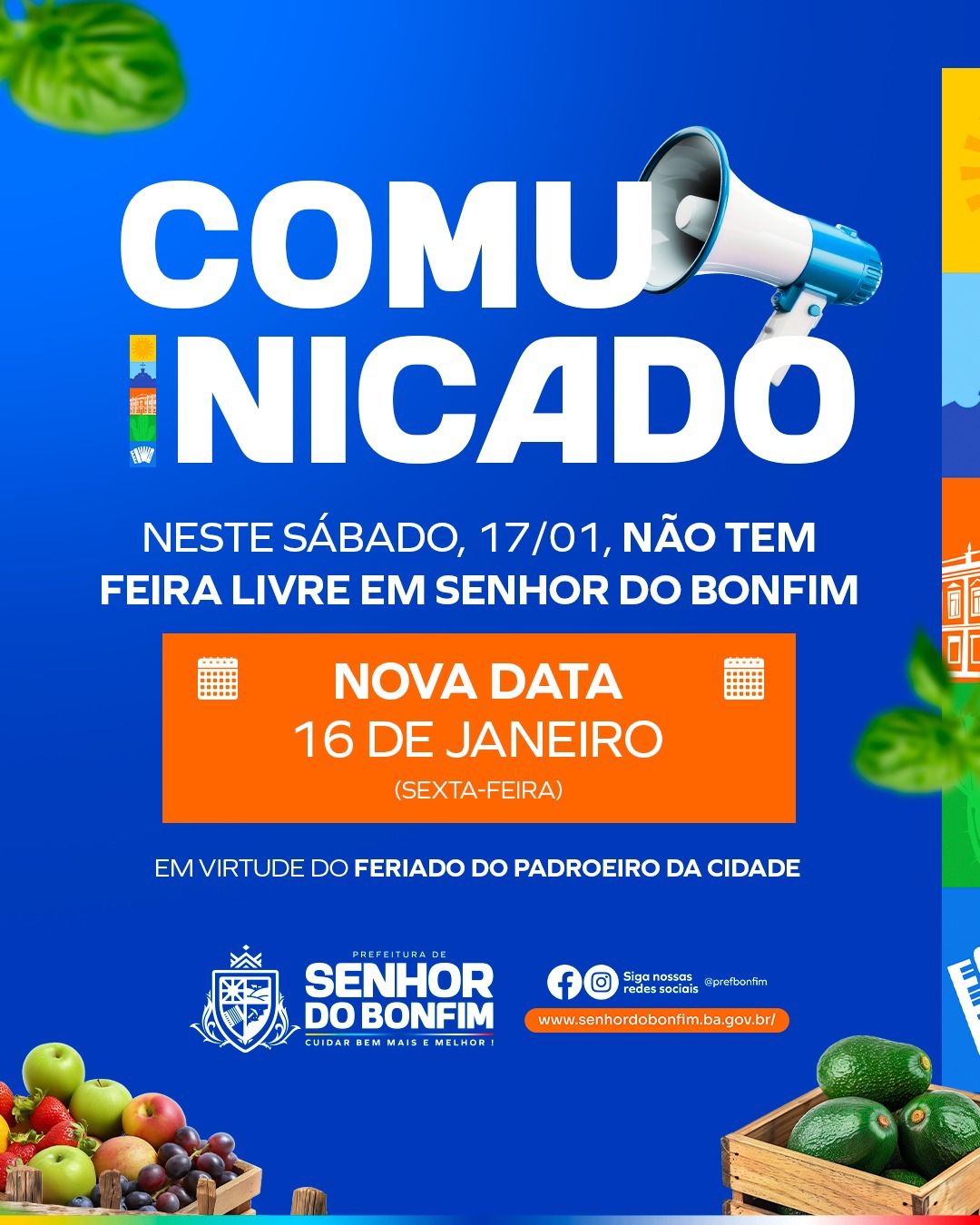 A Prefeitura de Senhor do Bonfim informa que a Feira Livre do município nesta semana será antecipada excepcionalmente para a sexta-feira (16), em virtude do feriado municipal de 17 de janeiro, data em que são celebrados os festejos do Padroeiro da cidade.