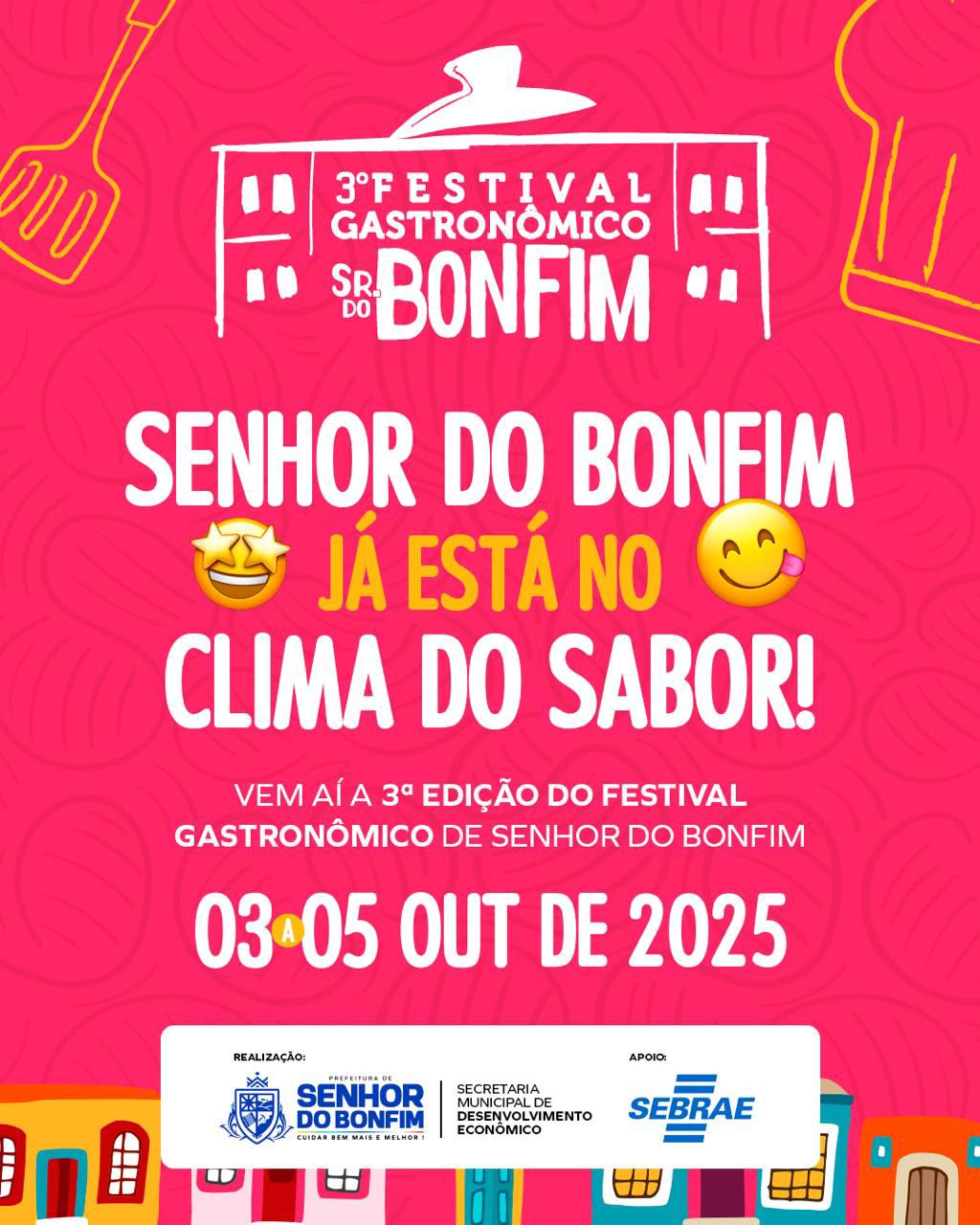 Senhor do Bonfim já respira o clima do maior festival gastronômico da região. Entre os dias 03 e 05 de outubro, acontece a 3ª edição do Festival Gastronômico de Senhor do Bonfim, realizado pela Prefeitura Municipal, por meio da Secretaria de Desenvolvimento Econômico e Turismo, em parceria com o Serviço Brasileiro de Apoio às Micro e Pequenas Empresas (Sebrae).