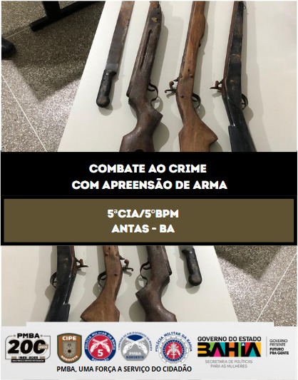 RESUMO: Por volta das 21:00 hs, a Guarnição da 5ª Cia/5ºBPM – Antas, recebeu uma ocorrência via CICOM, onde um indivíduo estaria armado com uma espingarda e ameaçando os próprios filhos de morte. De imediato a Guarnição deslocou até o local e identificou o suspeito próximo à residência da família. Ao avistar a Guarnição, o mesmo dispensou a espingarda em um terreno baldio, porém a guarnição encontrou a arma e deu voz de prisão ao referido suspeito. Em Ato contínuo e com permissão da esposa do autor, foram realizadas buscas na residência do conduzido, onde foram localizadas mais 02 espingardas é 01 facão também utilizados para ameaçar as vítimas de forma constante. Diante dos fatos deslocamos até a Delegacia de Polícia Civil de Ribeira do Pombal, para a devida apresentação.