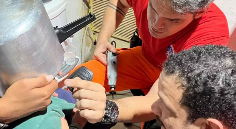 Um menino de 2 ano de idade ficou mais de uma hora com uma panela de pressão presa na cabeça em Alto Paranaíba, Minas Gerais. A informação foi confirmaa pelo sargento do Corpo de Bombeiros Nilton Neto, que não soube explicar como a criaça foi parar nessa situação.