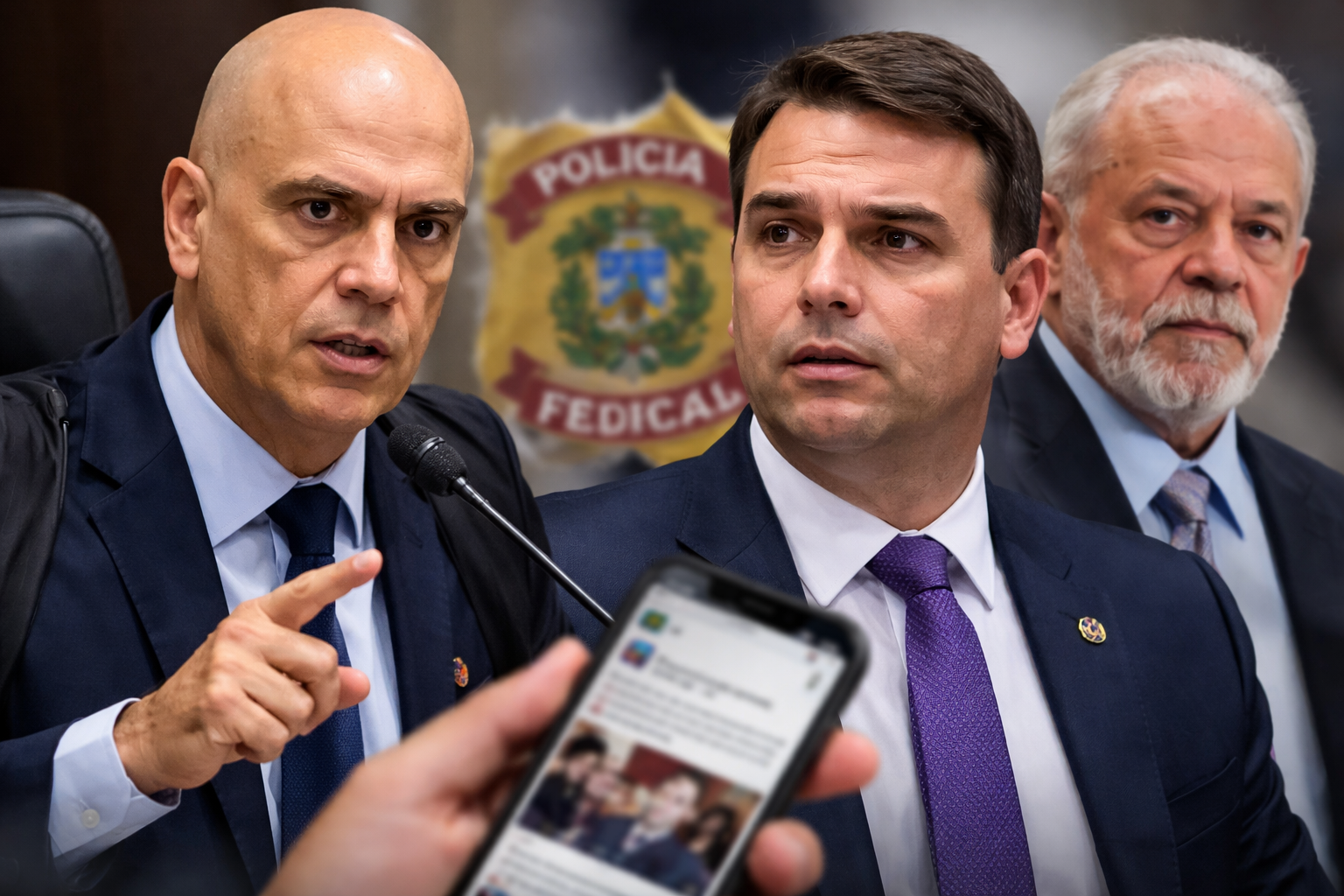 O ministro do Supremo Tribunal Federal, Alexandre de Moraes, determinou a abertura de inquérito pela Polícia Federal para investigar o senador Flávio Bolsonaro após uma publicação nas redes sociais envolvendo o presidente Luiz Inácio Lula da Silva.