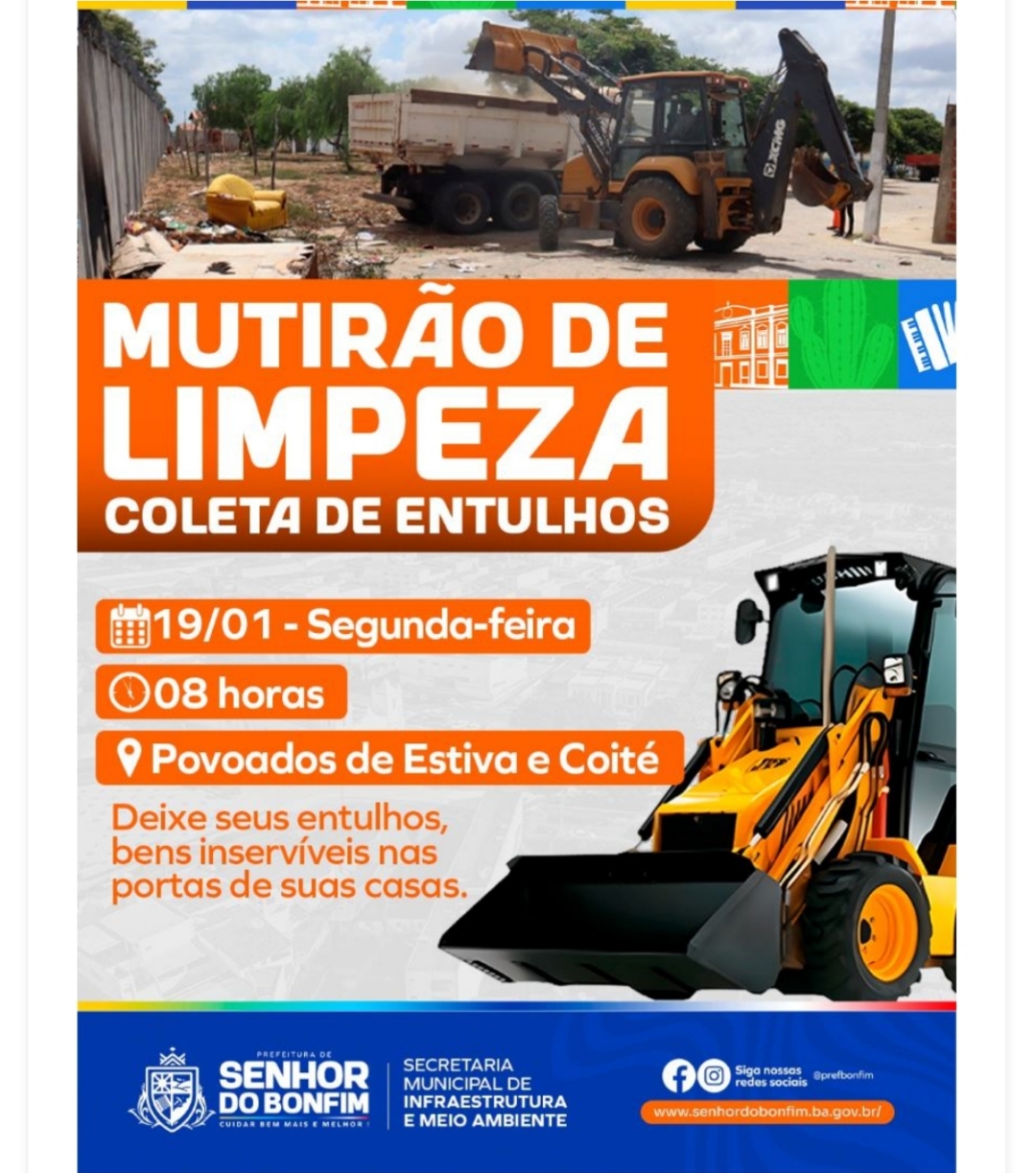 A Prefeitura de Senhor do Bonfim, por meio da Secretaria de Infraestrutura e Meio Ambiente, realiza nesta segunda-feira (16) o Mutirão de Limpeza com coleta de entulhos, nas comunidades de Estiva e Coité, dando continuidade às ações de cuidado com a cidade e promoção da saúde pública.