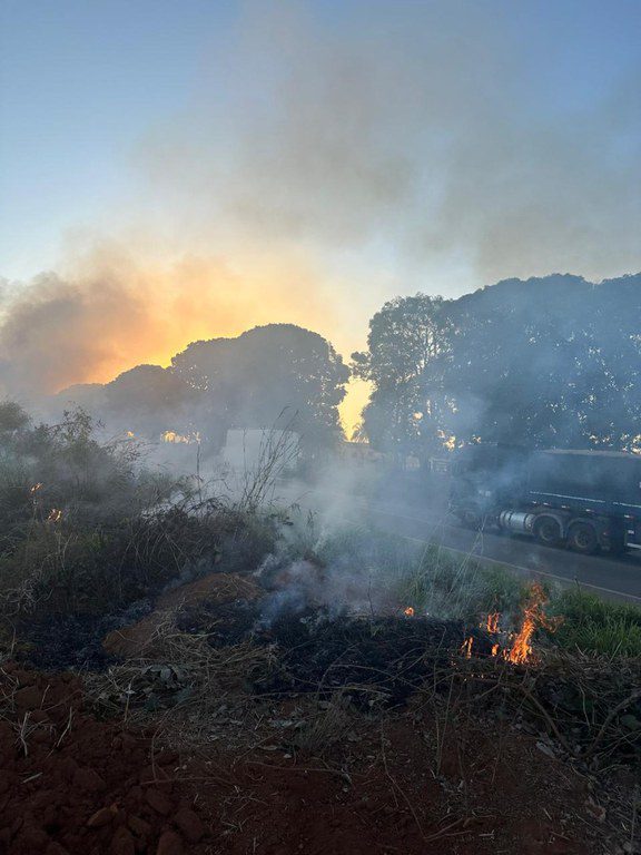 Durante a fiscalização, a equipe policial visualizou foco de incêndio de grandes proporções, acompanhado de intensa fumaça que comprometia significativamente a visibilidade dos condutores na principal rodovia federal do estado. No local, os policiais identificaram um dos suspeitos utilizando uma vara para expandir as chamas com o objetivo de limpar a vegetação na frente de uma propriedade rural.