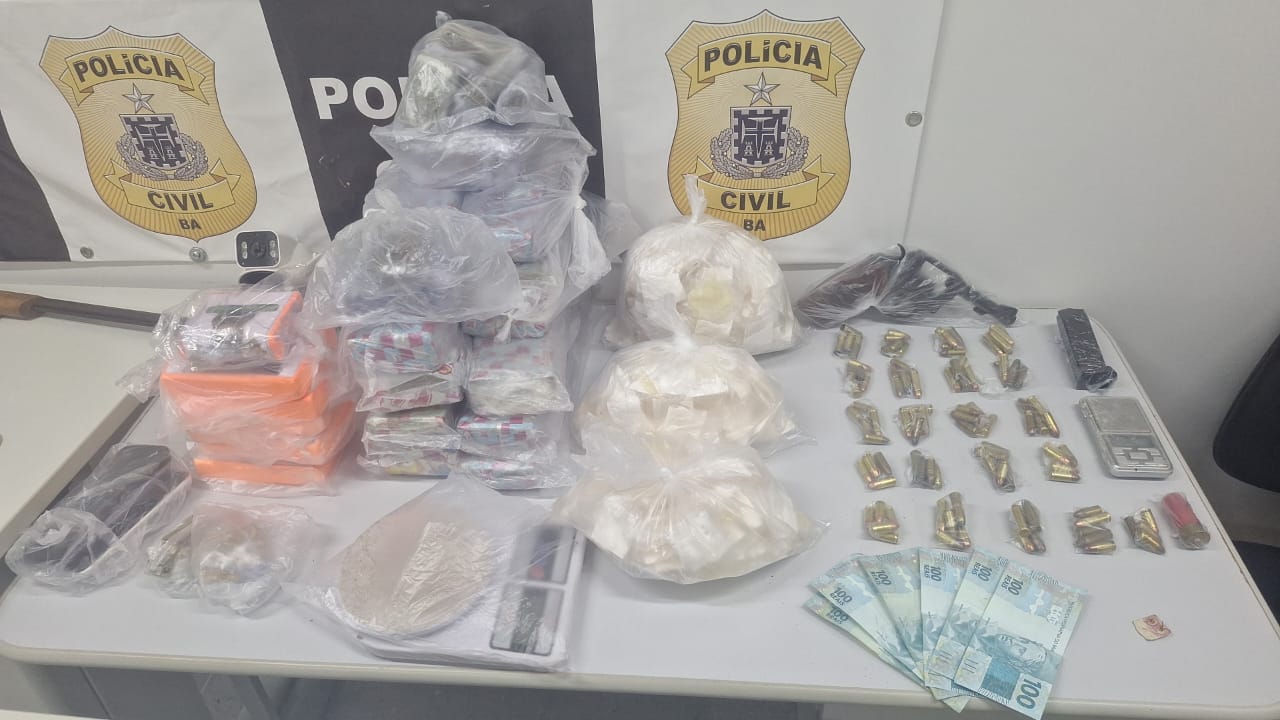 Nesta quinta-feira, 23 de outubro de 2025, por volta das 11h00min, uma ação integrada entre a Polícia Civil da Bahia, por meio da Delegacia Territorial de Cansanção, e a Polícia Militar da Bahia, através do 2º Pelotão local, resultou na apreensão de grande quantidade de drogas, armas de fogo, celulares e balanças de precisão na localidade de Água Branca, zona rural deste município.