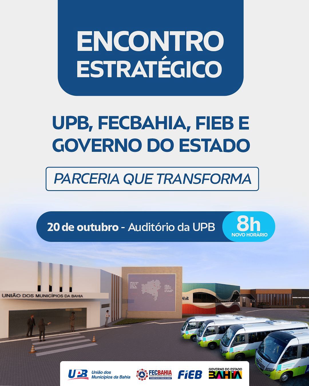 A União dos Municípios da Bahia (UPB) realiza nesta segunda-feira (20), às 8h, o Encontro Estratégico: Parceria que Transforma, em sua sede, no CAB. O evento celebra a união entre UPB, FECBAHIA, FIEB, Governo do Estado e Governo Federal, em prol do fortalecimento dos municípios e contará com a presença do governador Jerônimo Rodrigues, do ministro Rui Costa, de senadores e deputados. No encontro serão anunciadas ações do Novo PAC Seleções para Saúde, com investimentos de R$310 milhões nos municípios baianos, para construção de Policlínicas, UBSs e unidades do CAPS.