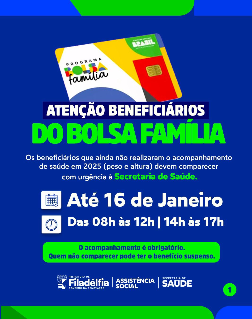 A Prefeitura de Filadélfia, por meio das Secretarias Municipais de Saúde e de Assistência Social, convoca as famílias beneficiárias do Programa Bolsa Família que ainda não realizaram o acompanhamento de saúde obrigatório referente ao 2º semestre de 2025. O prazo para regularização é de 05 a 16 de janeiro, evitando a suspensão do benefício.