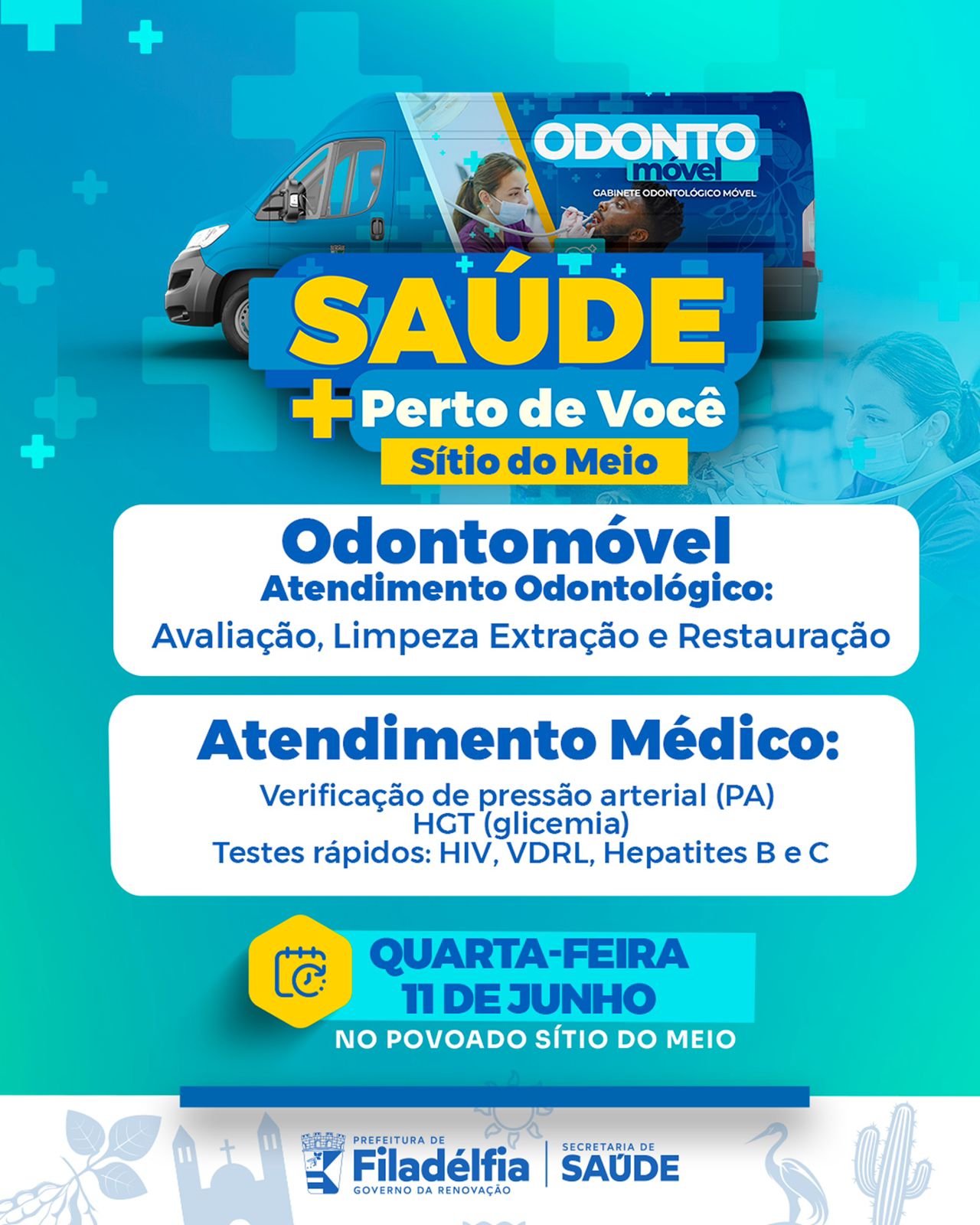 A Prefeitura de Filadélfia, por meio da Secretaria Municipal de Saúde, realiza nesta quarta-feira, 11 de junho, mais uma edição do programa Saúde + Perto de Você, desta vez na comunidade de Sítio do Meio. A ação visa ampliar o acesso aos serviços de saúde para a população da zona rural, promovendo atendimento gratuito, humanizado e com qualidade.