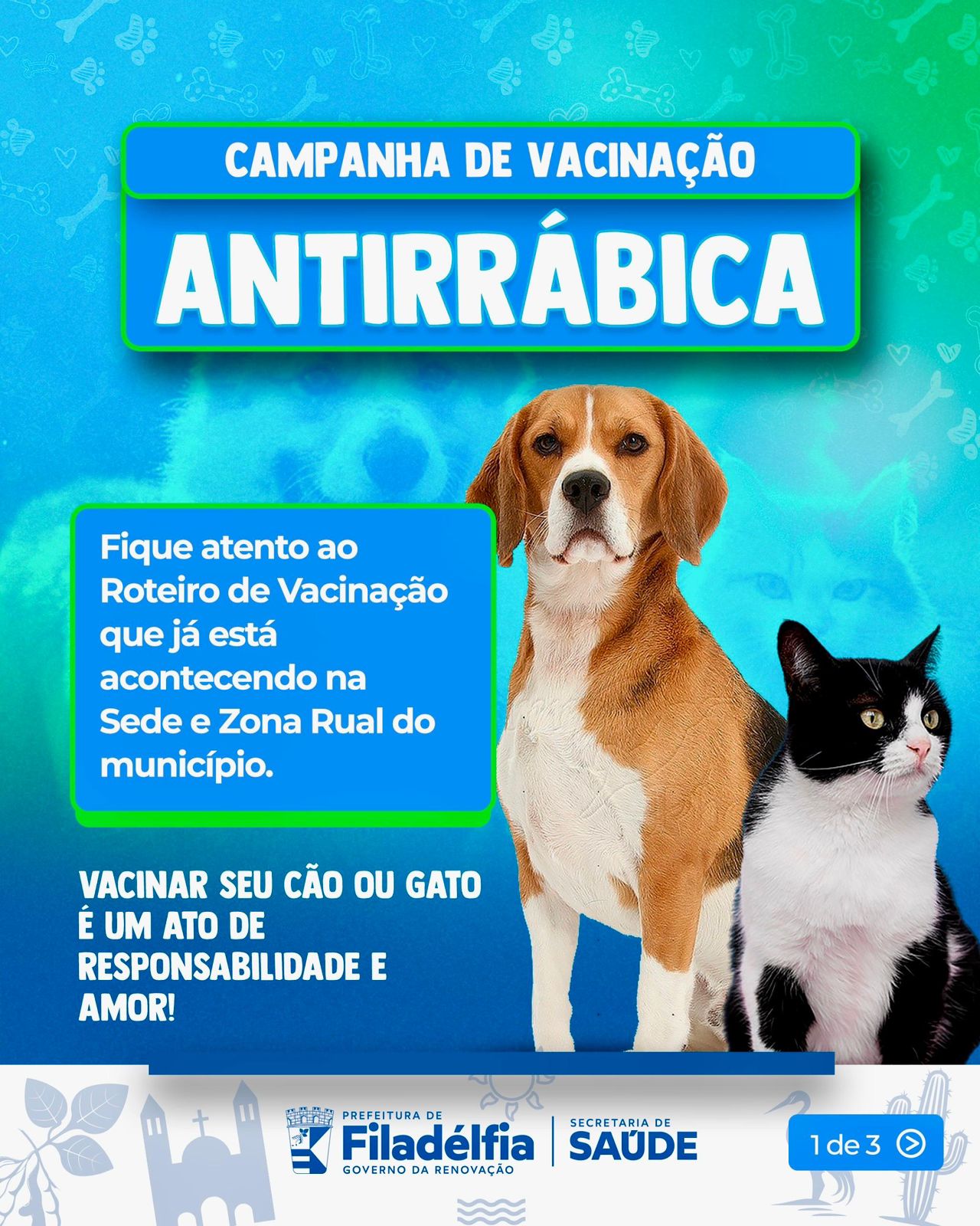 A Prefeitura de Filadélfia, por meio da Secretaria Municipal de Saúde, está realizando a Campanha de Vacinação Antirrábica, que já contempla tanto a sede do município quanto a zona rural. A iniciativa tem como objetivo proteger cães e gatos contra a raiva, uma doença grave e fatal que pode ser transmitida aos seres humanos.