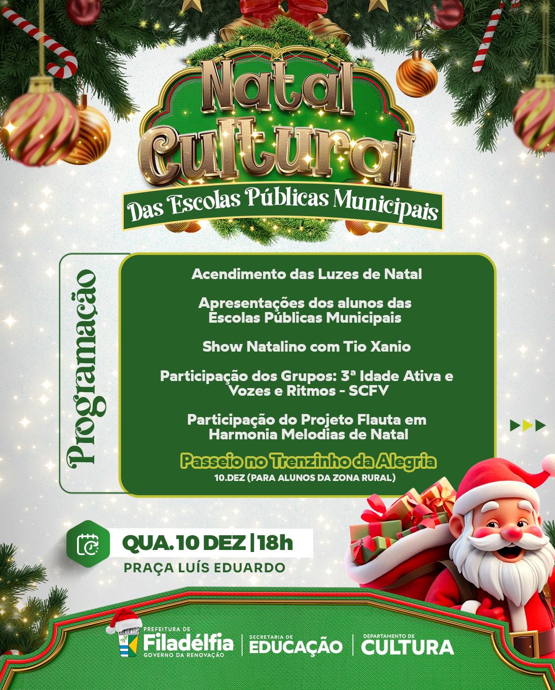 A Prefeitura de Filadélfia realiza o Natal Cultural das Escolas Públicas Municipais, um evento oficial que celebra a educação, a cultura e as tradições natalinas no município. A programação acontece nesta quarta-feira, 10 de dezembro, a partir das 18h, na Praça Luís Eduardo, reunindo alunos, famílias e a comunidade em geral.
