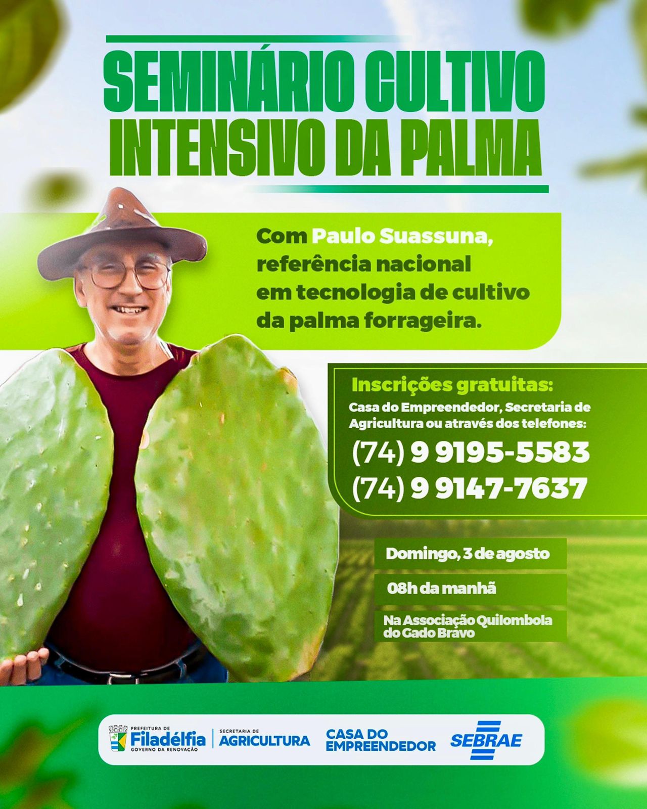 A Prefeitura de Filadélfia, por meio da Secretaria Municipal de Agricultura e da Casa do Empreendedor, em parceria com o Sebrae, promove no próximo dia 3 de agosto (domingo) o Seminário sobre Cultivo Intensivo da Palma Forrageira.