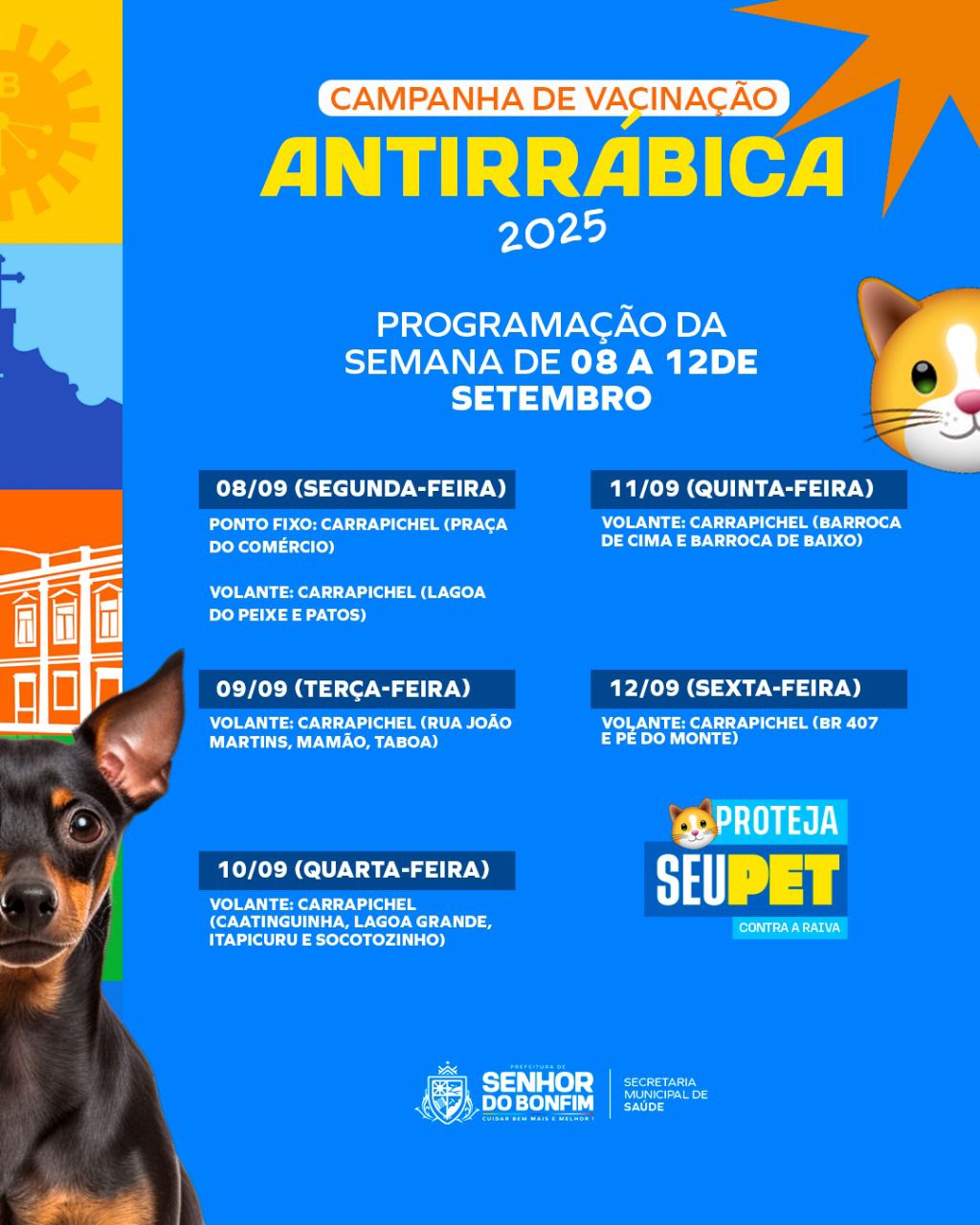 A Prefeitura de Senhor do Bonfim, por meio da Secretaria Municipal de Saúde, divulga o cronograma da campanha de vacinação antirrábica no distrito de Carrapichel. A ação acontece entre os dias 08 e 12 de setembro, com pontos fixos e equipes volantes garantindo a imunização de cães e gatos da comunidade.