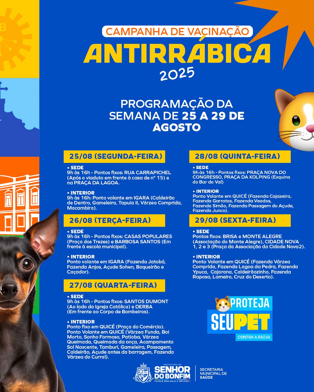 A Prefeitura de Senhor do Bonfim, por meio da Secretaria Municipal de Saúde, inicia mais uma etapa da Campanha de Vacinação Antirrábica, que acontece de 25 a 29 de agosto em diversos pontos da sede e do interior. A ação segue até o dia 3 de outubro, com a meta de imunizar 14.410 cães e 4.803 gatos, totalizando 19.213 animais em todo o município.