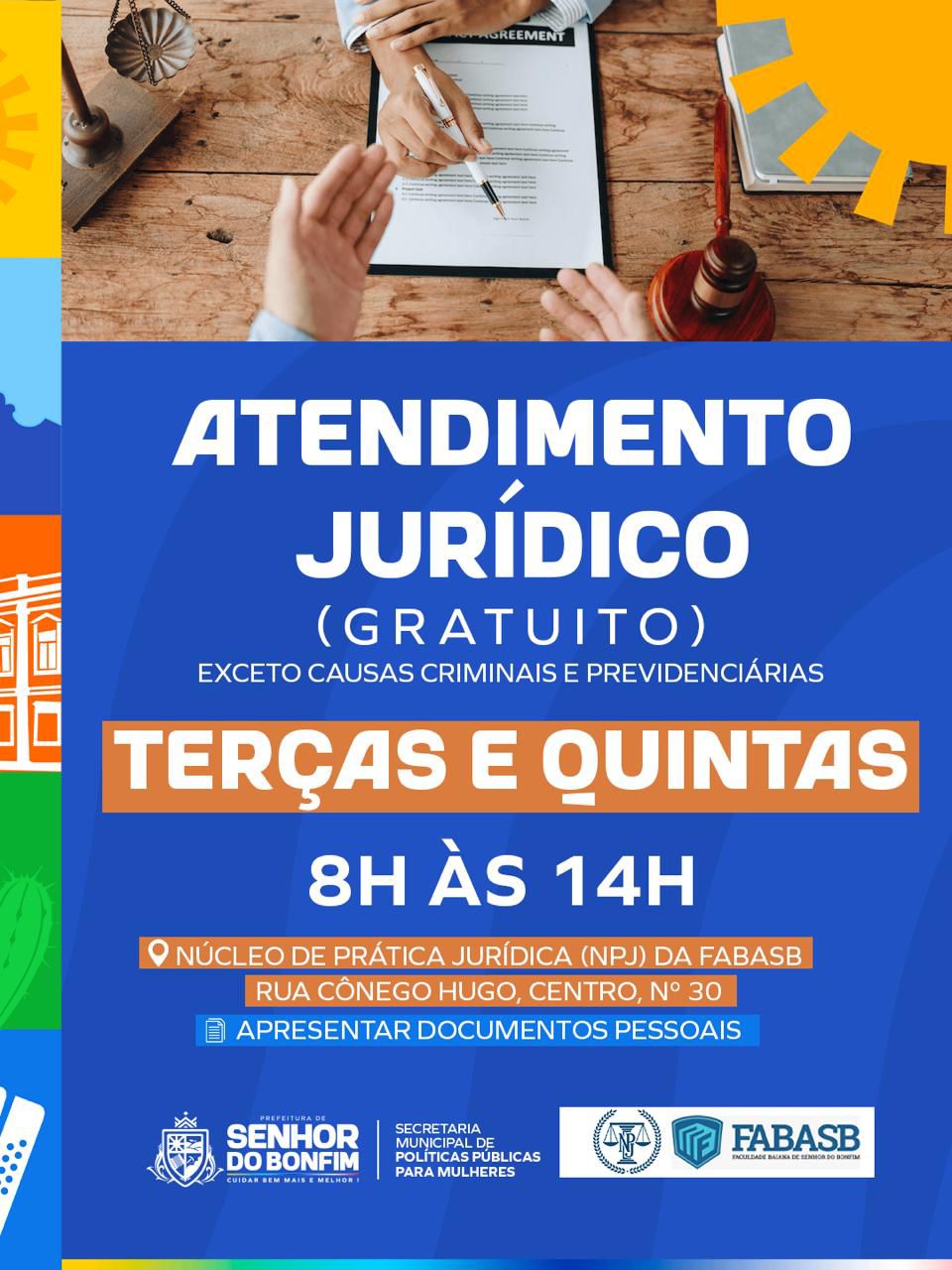 A Prefeitura de Senhor do Bonfim, por meio da Secretaria Municipal de Políticas Públicas para Mulheres, em parceria com a Faculdade Baiana de Senhor do Bonfim (FABASB), está ofertando atendimento jurídico gratuito.