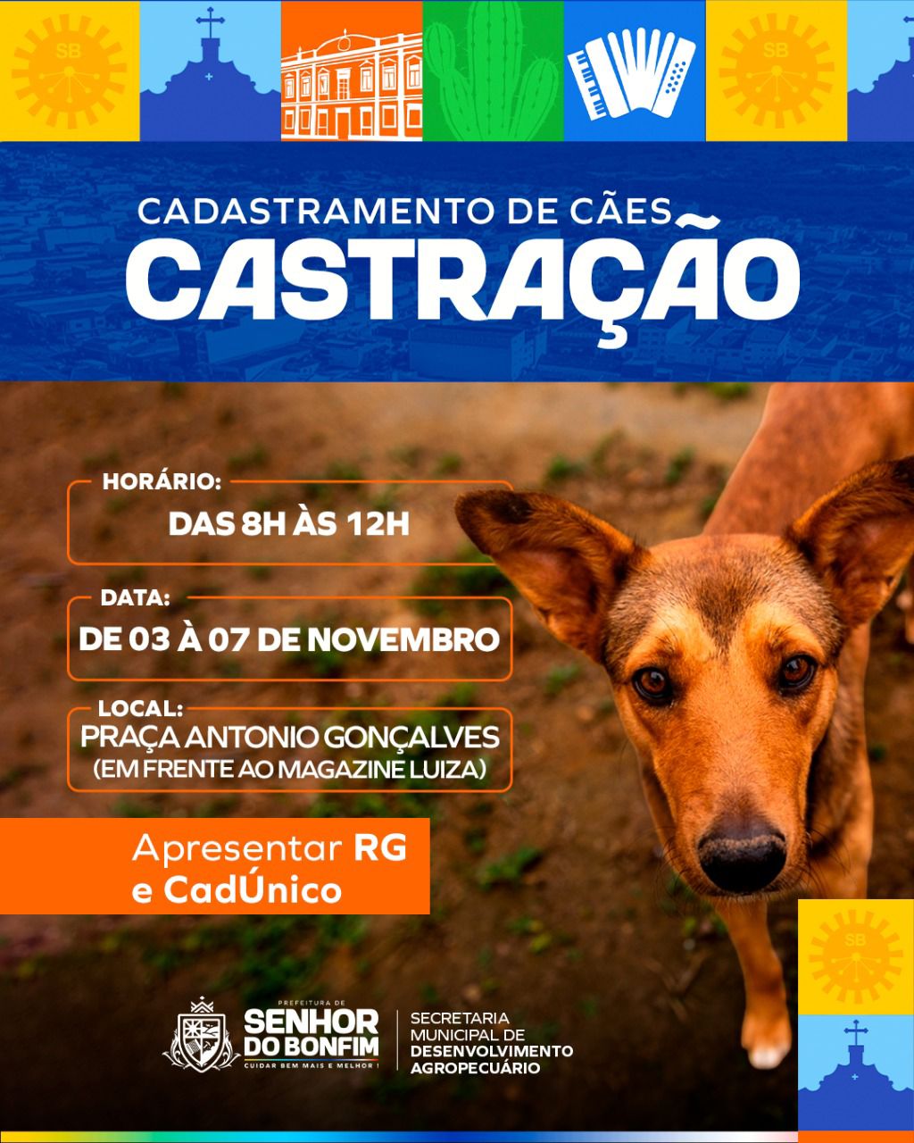 A Prefeitura de Senhor do Bonfim, por meio da Secretaria Municipal de Desenvolvimento Agropecuário, realizará o cadastramento para o mutirão de castração de cães entre os dias 3 e 7 de novembro, das 8h às 12h, na Praça Antônio Gonçalves (em frente ao Magazine Luiza).