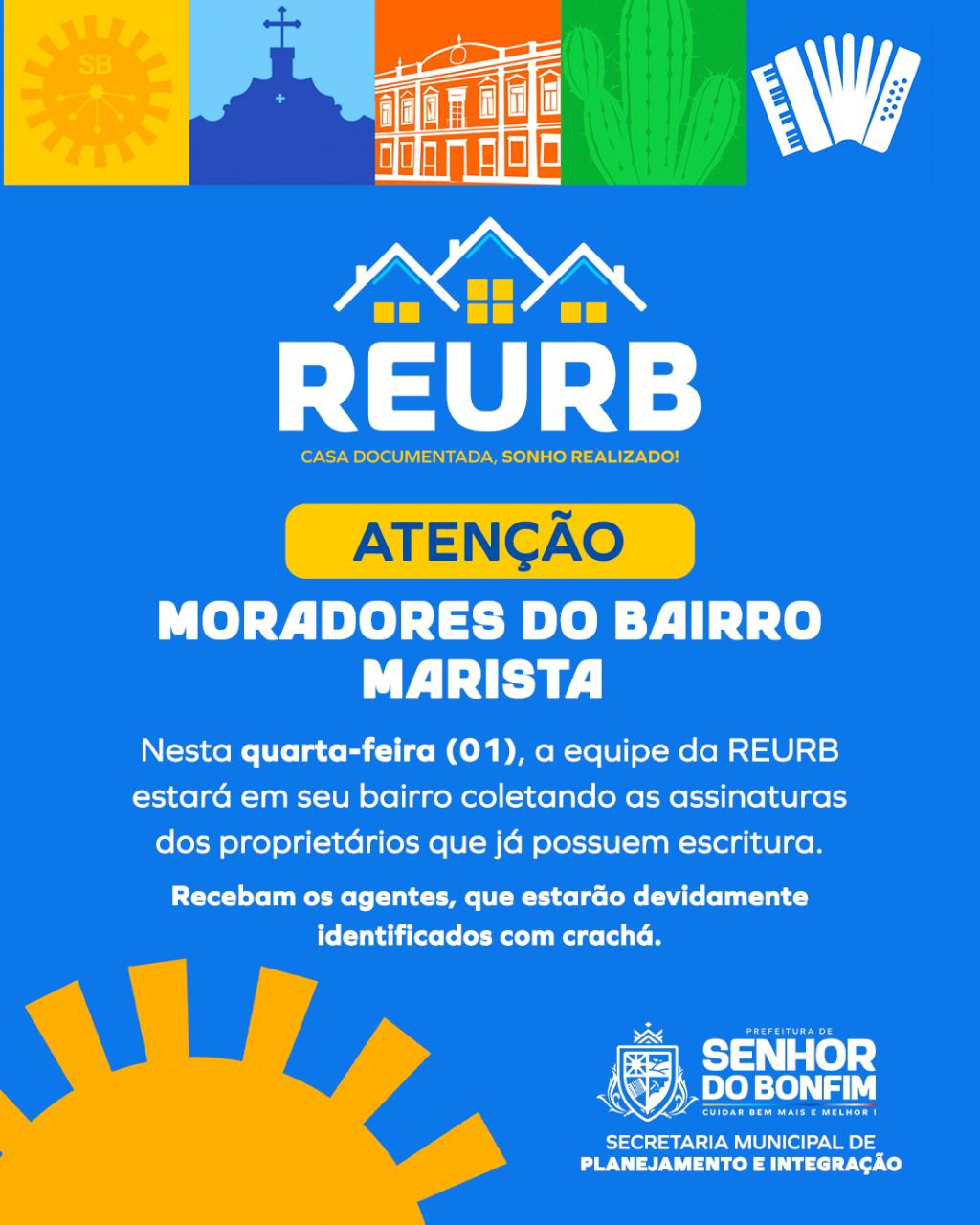 A Prefeitura de Senhor do Bonfim, por meio da Secretaria Municipal de Planejamento e Integração, segue avançando com o programa de Regularização Fundiária Urbana (REURB). Nesta quarta-feira (1º), a equipe técnica estará no bairro Marista para realizar a coleta das assinaturas dos proprietários que já possuem escritura.