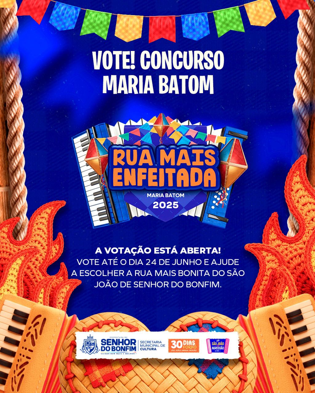 Está aberta a votação do concurso “Maria Batom – Rua Mais Enfeitada”, uma iniciativa da Prefeitura de Senhor do Bonfim dentro da programação oficial do São João 2025. A ação tem como objetivo resgatar as tradições juninas, estimular o envolvimento comunitário e promover o embelezamento dos bairros durante o período mais festivo do ano.
