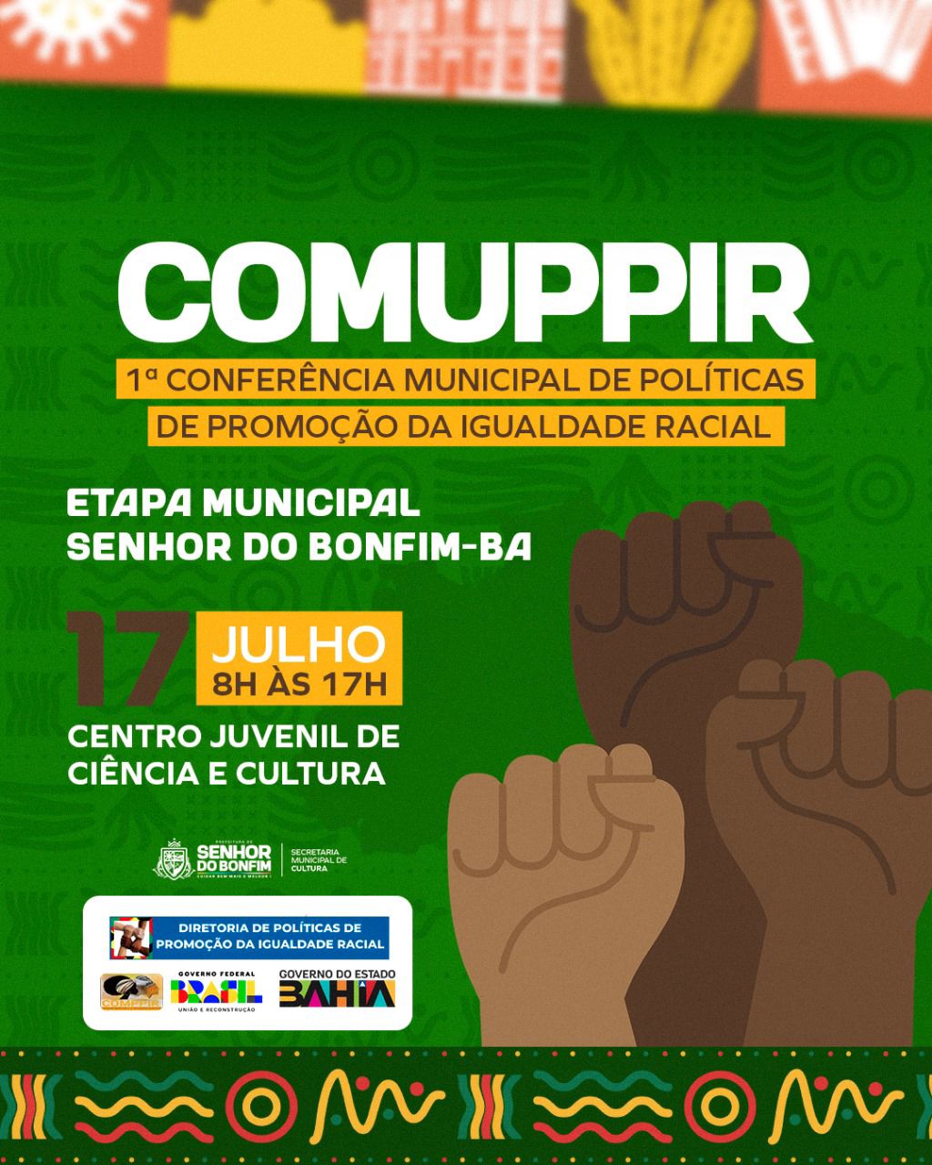 O Conselho Municipal de Políticas de Promoção da Igualdade Racial em parceria coma Prefeitura de Senhor do Bonfim, por meio da Diretoria de Políticas de Promoção da Igualdade Racial da Secretaria Municipal de Cultura, promove nesta quinta-feira (17), das 8h às 17h, no Centro Juvenil de Ciência e Cultura, a 1ª Conferência Municipal de Políticas de Promoção da Igualdade Racial, com o tema central: “Igualdade e Democracia: Reparação e Justiça Social”.