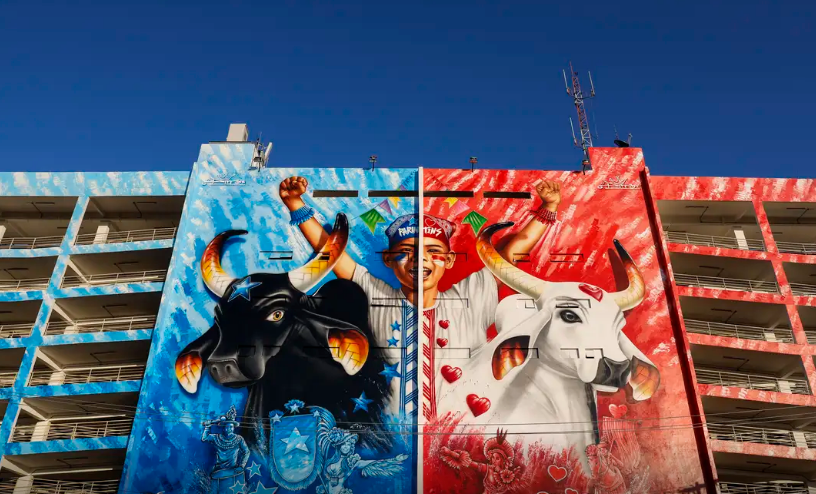 Os guindastes são utilizados no festival como parte fundamental da cenografia dos bois, e ajudam a movimentar grandes alegorias, estruturas que chegam a ter dezenas de metros de altura, e a içar artistas que fazem parte das encenações. O uso dos guindastes é indispensável para dar vida à grandiosidade e ao efeito visual das encenações no bumbódromo.
